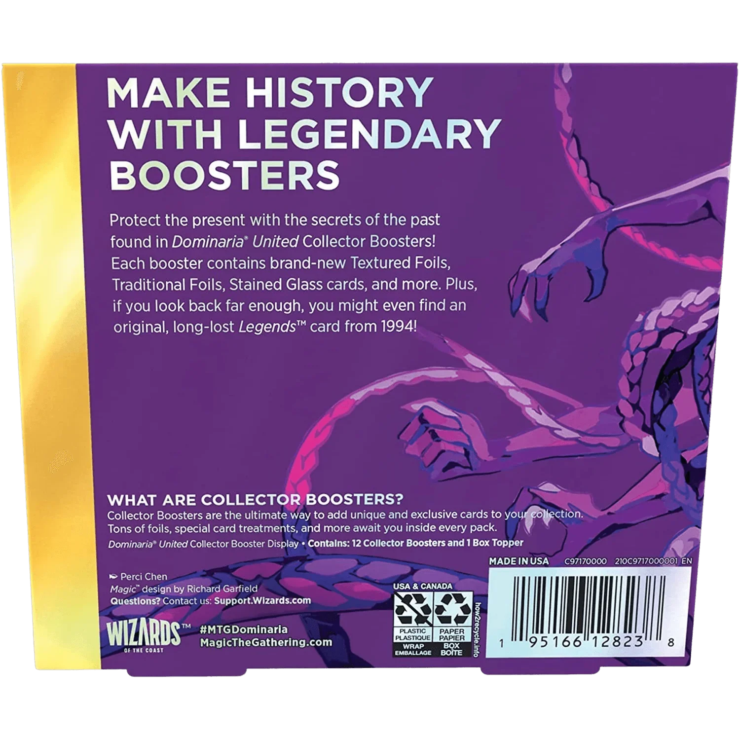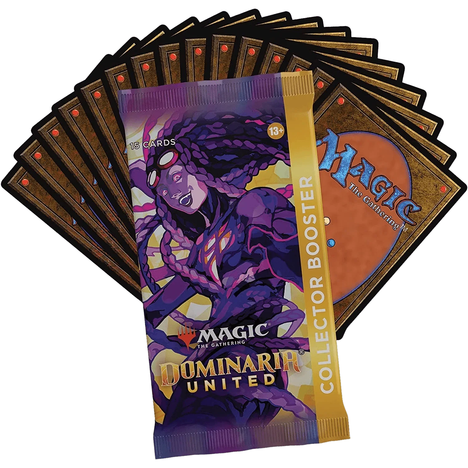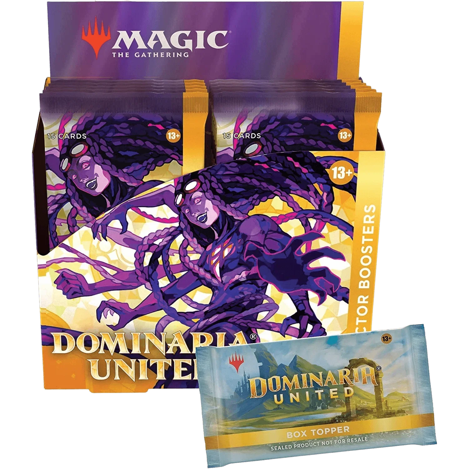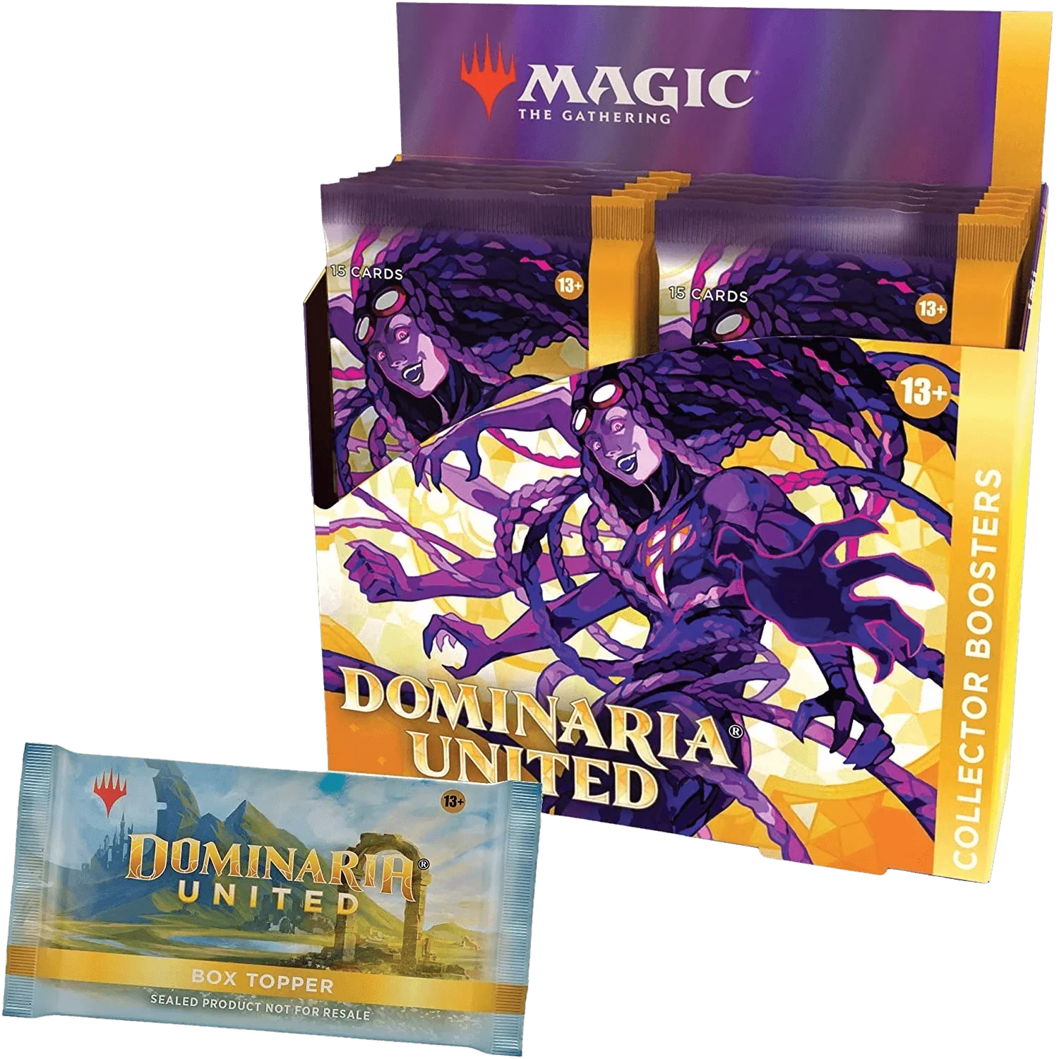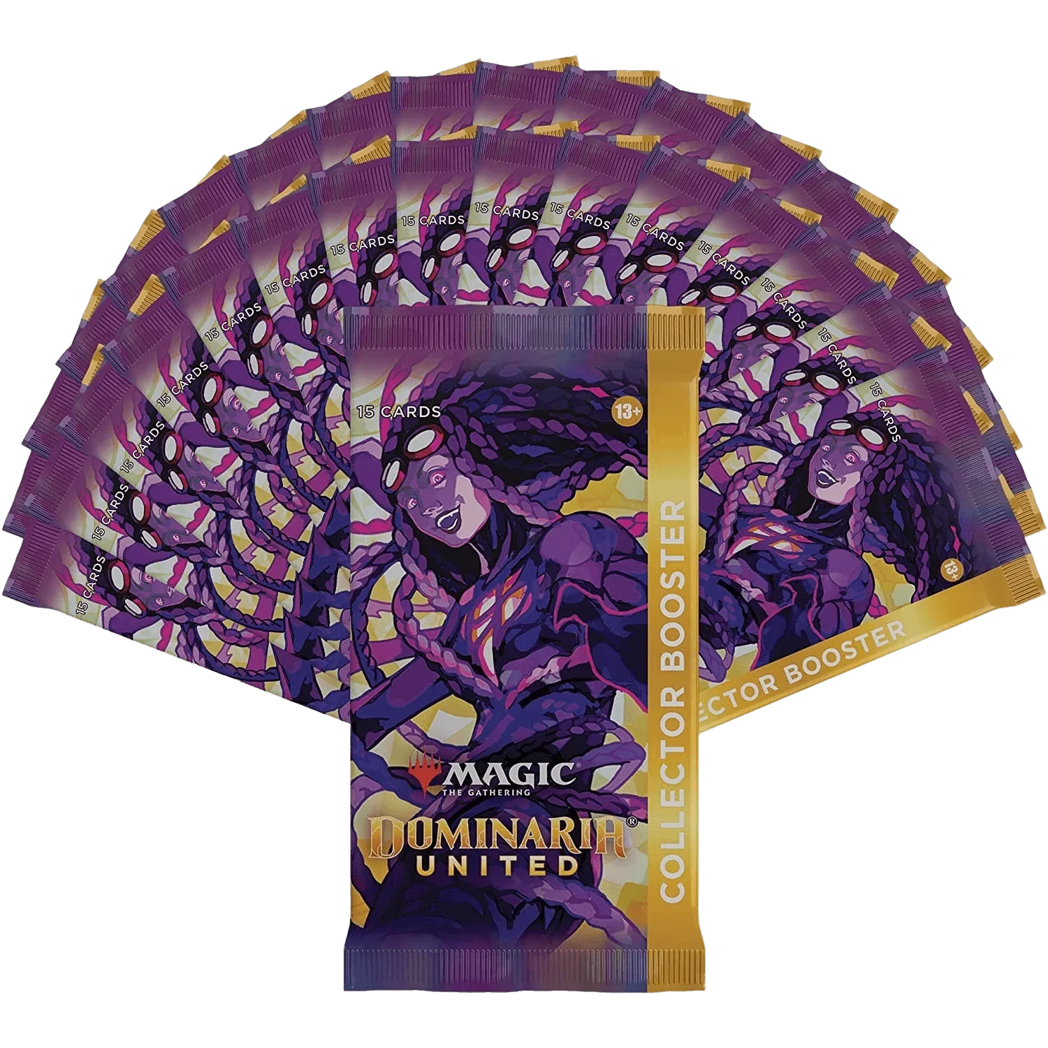 The Dominaria United Collector Booster Box contains 12 Dominaria United Collector Boosters and 1 Traditional Foil Box Topper card. Each Collector Booster contains 15 Magic: The Gathering cards and 1 Traditional Foil double-sided token, with a combination of 5–6 cards of rarity Rare or higher and 4–5 Uncommon, 4 Common, and 1 Land cards, with a total of 10–13 foil cards. Foil Borderless Mythic Rare Planeswalker in 2% of boosters