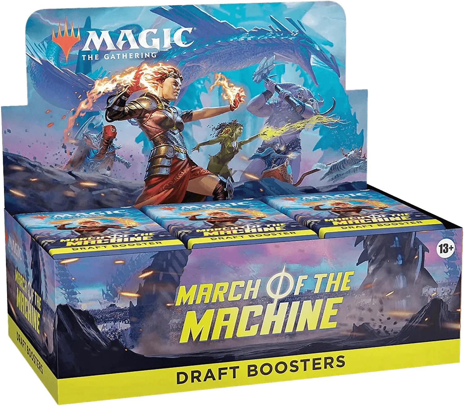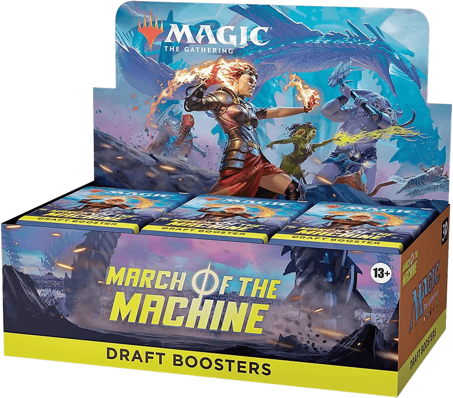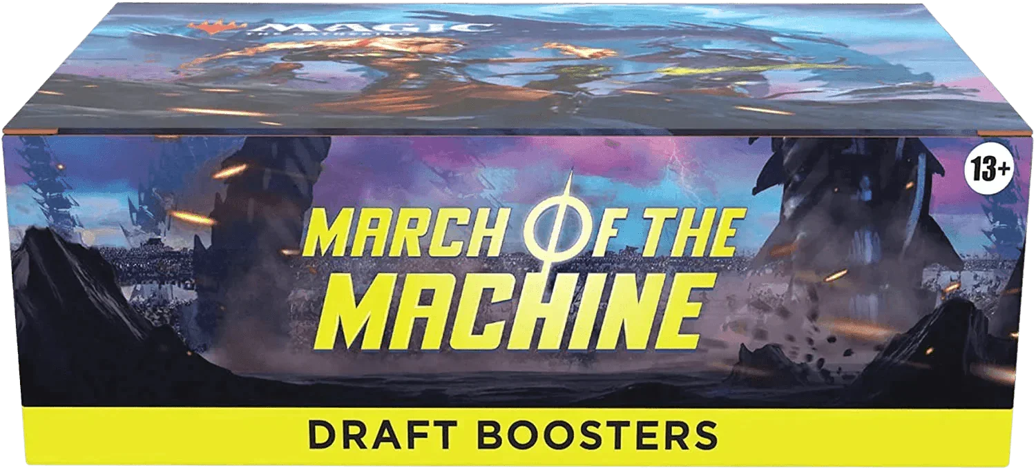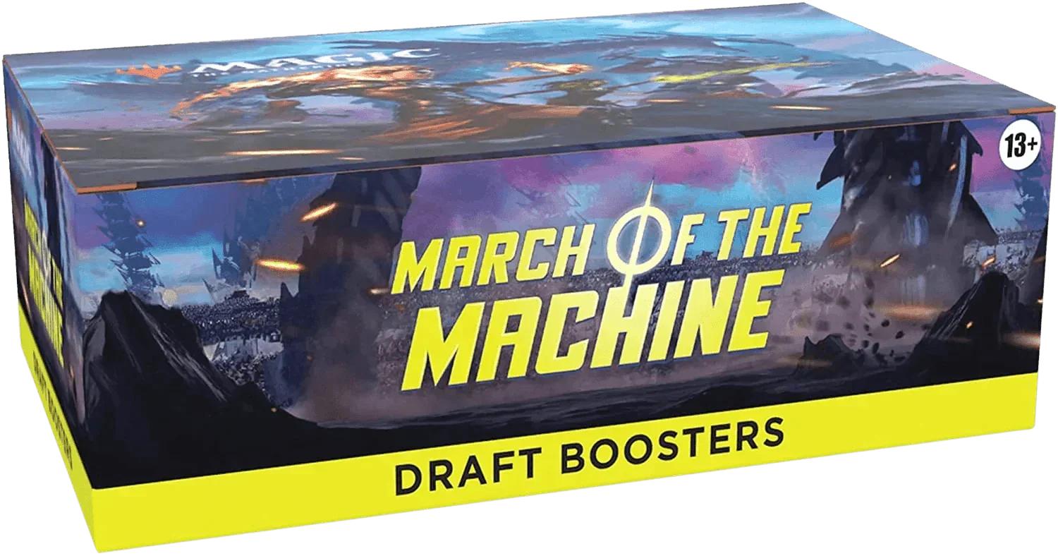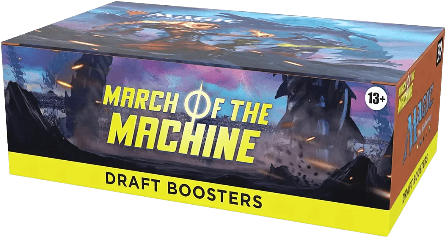 The March of the Machine Draft Booster Box contains 36 March of the Machine Draft Boosters. Each Draft Booster contains 15 cards and 1 token/ad card or Helper card, including 1–2 card(s) of rarity Rare or higher and 3–5 Uncommon, 8–9 Common, and 1 Land cards. Traditional Foil Borderless Mythic Planeswalker in <1% of boosters. Traditional Foil of any rarity replaces a Common in 33% of boosters.