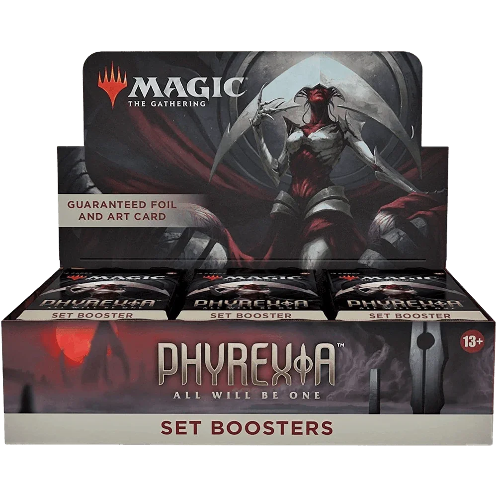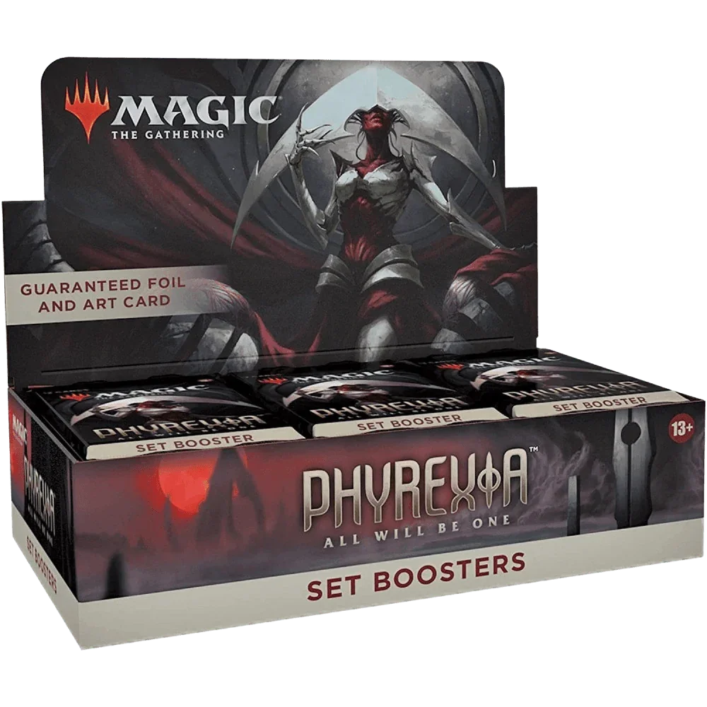 The Phyrexia: All Will Be One Set Booster Box contains 30 Phyrexia: All Will Be One Set Boosters. Each Set Booster contains 12 Magic cards, 1 Art Card, and 1 token/ad card or card from “The List” (a special card from Magic's history or Universes Within card—found in 25% of packs).