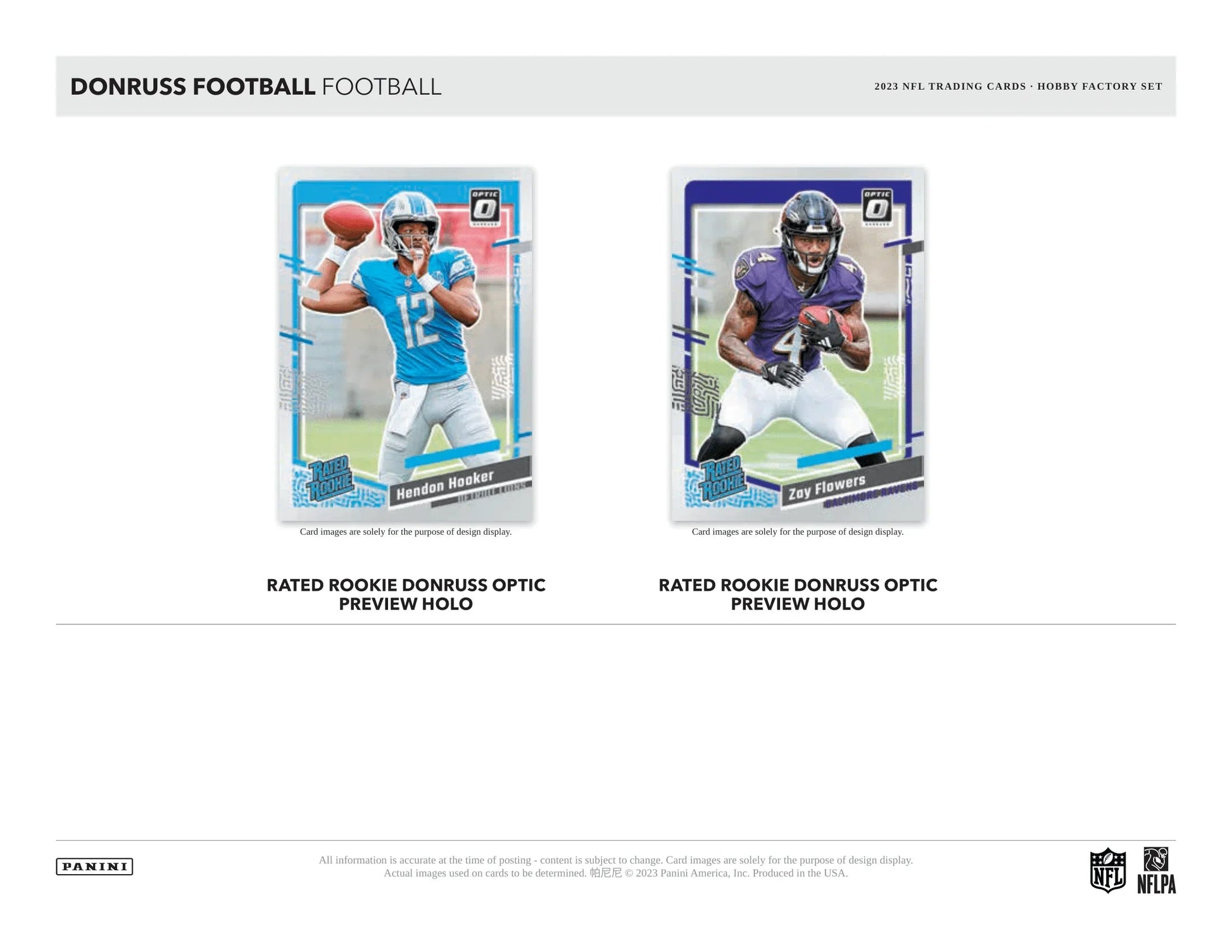 2023 Donruss NFL Football Hobby Factory Set is a great way to collect all of the NFL’s top veterans, rookies and retired greats! The Hobby Factory Set includes the 400-Card Base Set (300 Base Cards, 100 Rated Rookies) plus (5) EXCLUSIVE Donruss Optic Rated Rookie Preview Holos!!