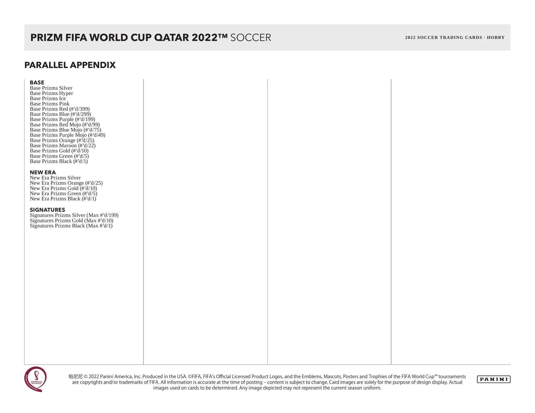 BASE: Collect a 300-card base set featuring players from all 32 qualified teams in the tournament. Find 12 Base parallels per box, on average, including the new Prizms Maroon (#'d/22) in honor of the predominant color of FIFA World Cup Qatar 2022.